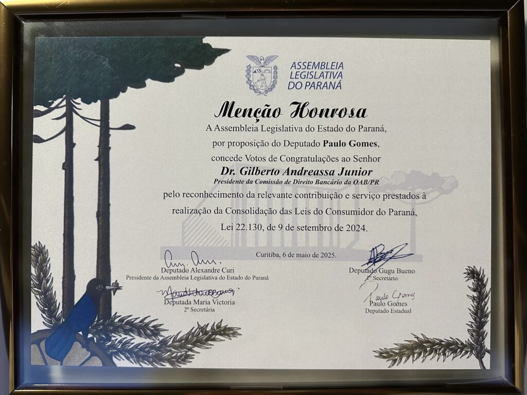 Sócio Gilberto Andreassa Junior é homenageado pela Assembleia Legislativa do Estado do Paraná (05.2025)